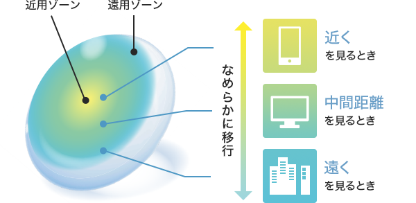 中心部から周辺部にいくにつれ、度数がなめらかに変化していくので、近方視点と遠方視点の移行がスムーズ。