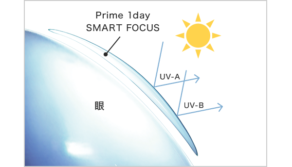 プライムワンデー スマートフォーカスは、UV-A(皮膚を老化させたり、肌を黒くする紫外線)を78%カット、UV-B(最も危険で日焼けや皮膚癌の原因となる紫外線)を97%カット。