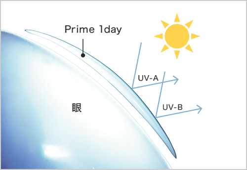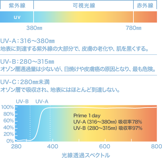 プライムワンデーは、UV-A(皮膚を老化させたり、肌を黒くする紫外線)を78%カット、UV-B(最も危険で日焼けや皮膚癌の原因となる紫外線)を97%カット。